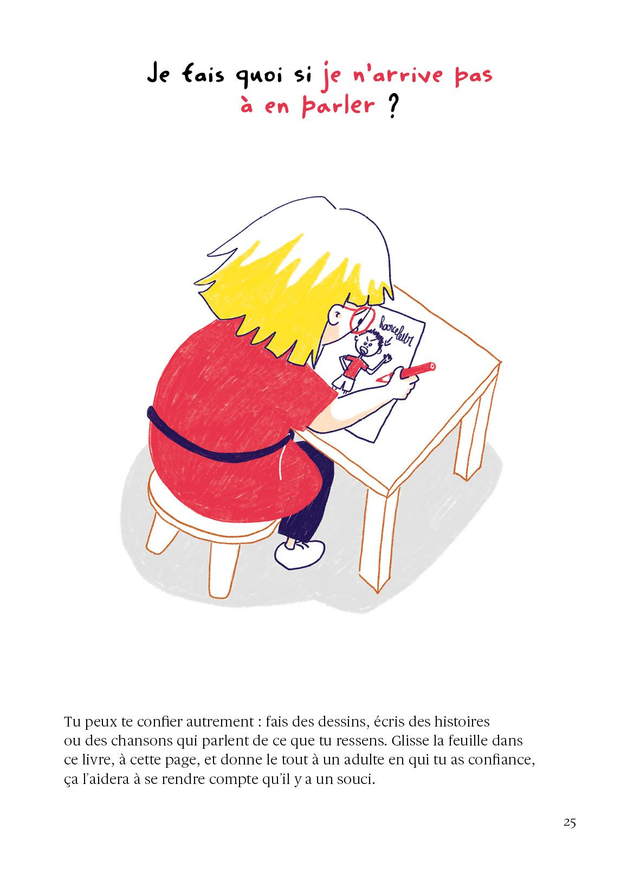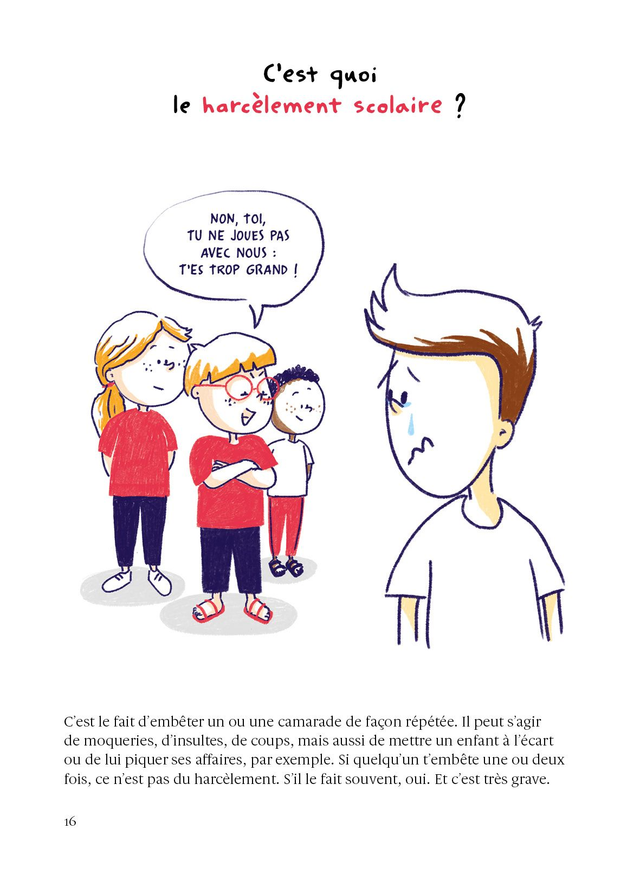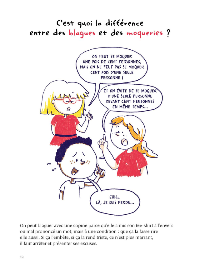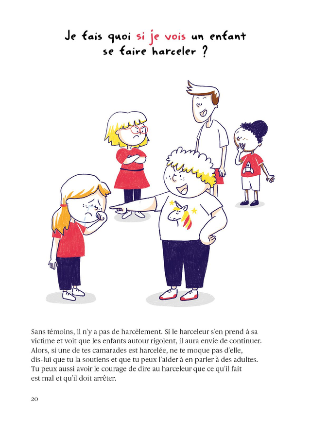 C’est quoi la différence entre des blagues et des moqueries ? Je fais quoi si je vois un enfant se faire harceler ? À chaque page, une question, un dessin, une réponse simple et claire, le tout inspiré par les nombreux entretiens menés avec des enfants mais aussi avec d’anciennes victimes de harcèlement. Qu’il soit harcelé, harceleur ou témoin, le jeune lecteur pourra piocher les conseils qui lui seront le plus utiles au moment de sa lecture. Surtout, avec ce livre, les autrices ont pour ambition de prévenir le harcèlement, en encourageant les enfants à prendre soin les uns des autres.